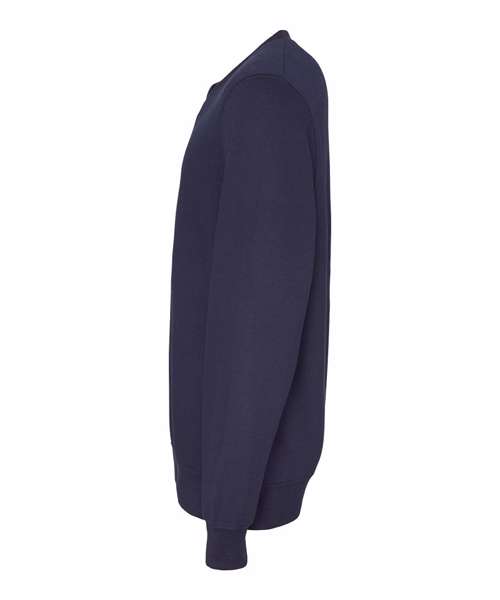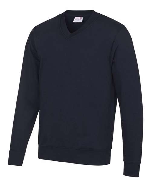 V-neckline sweatshirt. Ribbed neckline, cuffs and hemline. Soft cotton faced fabric creates ideal printing surface. Name label. Taped neck at back neck. Twin needle stitching for durability.