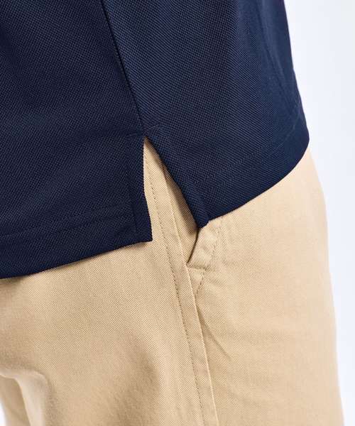 Polyester. Contemporary fit. 2 button placket. Short sleeves. Side vents. Knitted collar. Machine washable. Quadcool four channel yarn. Sweat wicking technology.