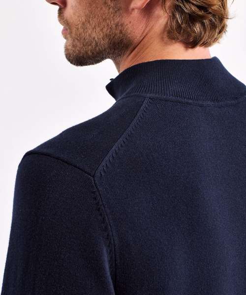 ¼ zip sweater. Decorative tuck stitching. Ribbed knit on the cuffs and hem. Product contains no branded neck label. Removable Kimble or looped garment tags. Inner seam label holds important product information on one label with a second label containing brand information which can be cut-away. Please note old stock may contain a fixed branded label.