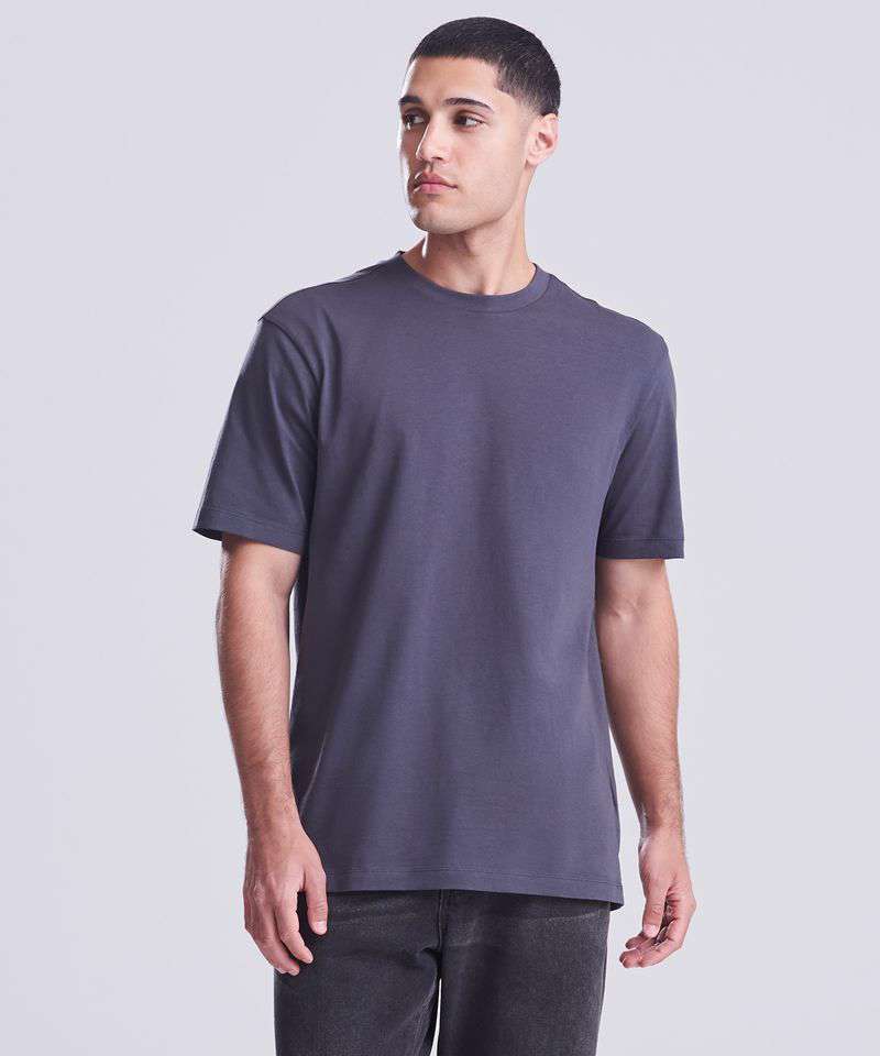 Relaxed fit T. Short sleeves. Side seams. PurePrint BC Cotton fabric. Taped back neck. Twin needle stitch details. Ribbed crew neck.