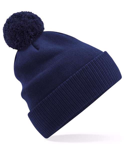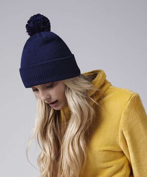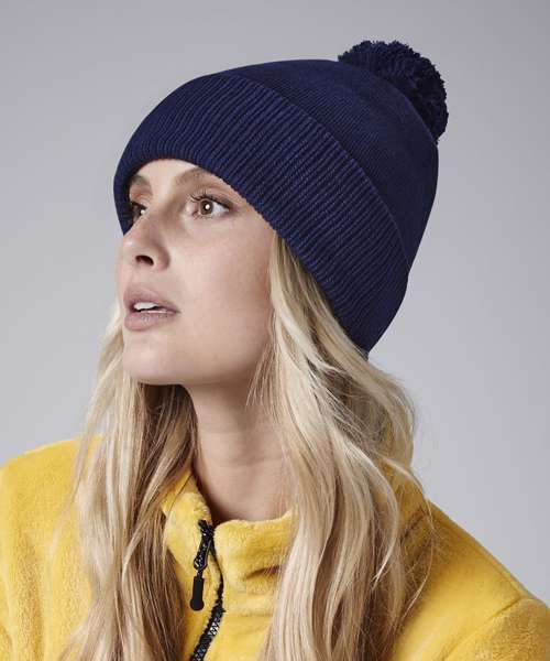 Contains 100% certified organic cotton. Double-layer knit. Ribbed cuff. Dual style – cuffed or slouch. Self-coloured pom pom. TearAway label for ease of rebranding.