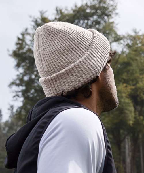 Contains at least 50% recycled polyester. Ribbed knit. Engineered crown for maximum comfort. Cotton Jersey lining for comfort and breathability. Wide cuffed design for optimal decoration. TearAway label for ease of rebranding.