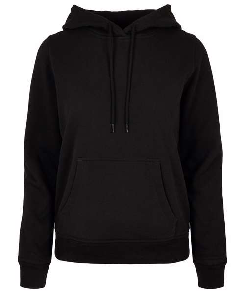 Classic cut and comfortable basic hooded sweatshirt for women. Hood, kangaroo pocket and wide cuffs on sleeves and hem provide the necessary comfort. The hooded sweatshirt is perfectly suited to be refined and can be easily customised.