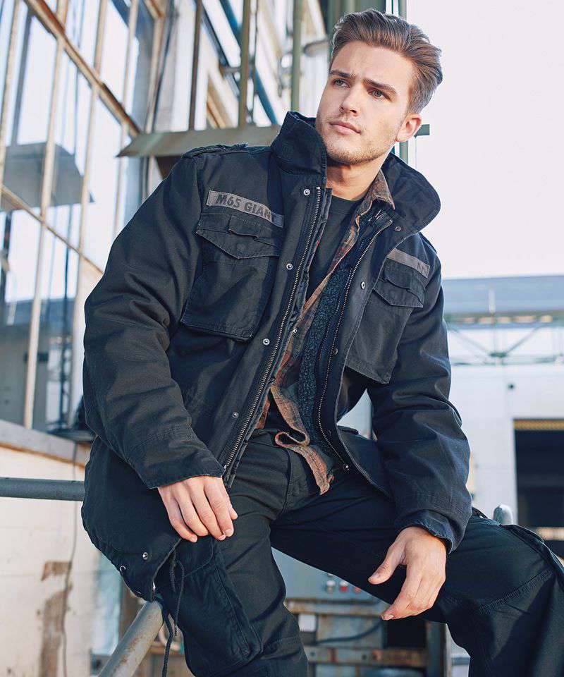 The M65 Giant jacket in vintage style has a real cult characteristic. Perfectly suitable for winter with a zipper to detach the quilted inner jacket made of nylon and a warm teddy-fabric lining.The outer jacket is made of premium, washed cotton and can also be worn without the lining as a transition jacket in spring or autumn. Typically M65 the Giant has 2 big chest pockets, 2 spacious flap pockets on the front, a covered cotton hood with drawstring, complete with poppers on the shoulder.
