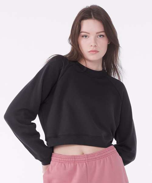 Side-seamed. Bound neck. Contoured seam on sleeves. Raglan sleeve. Mid-length. Tear-away label.