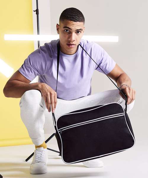 Retro styling. Adjustable shoulder strap. Zippered front pocket. Internal valuables pocket. Internal baseboard.