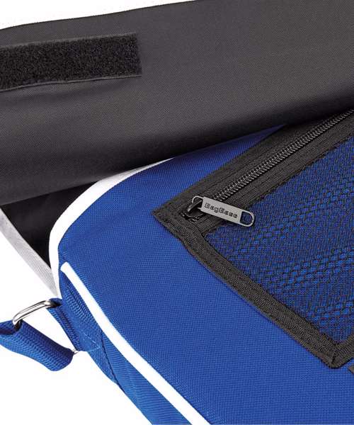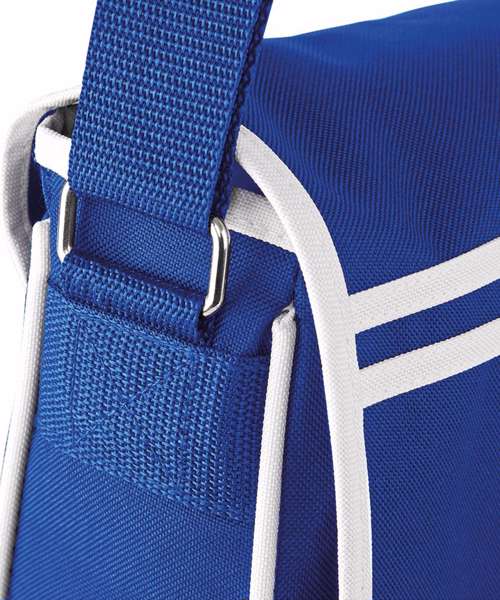 Retro styling. Adjustable shoulder strap. Zippered mesh pocket under flap. Rip-Strip™ closure. Contrast detailing. Reach certified.