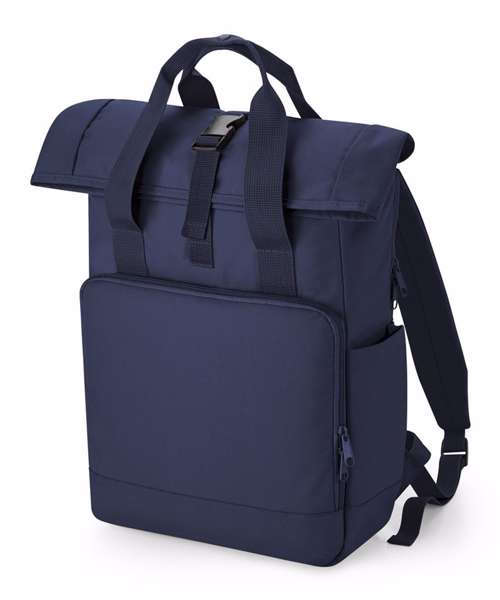 Contains 100% certified recycled polyester. External access secure padded laptop compartment. Laptop compatible up to 15.6". Zipped internal pocket. Front pocket organiser section. Front pocket designed for easy decoration. External bottle pocket. Padded back panel. Roll-top closure. Padded adjustable shoulder straps. Webbing carry handles. TearAway label for ease of rebranding.