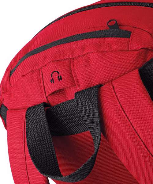 Padded adjustable shoulder straps. Zippered top pocket. Internal organiser section. Padded back panel. Side mesh pocket. Grab handle. Large internal pocket.