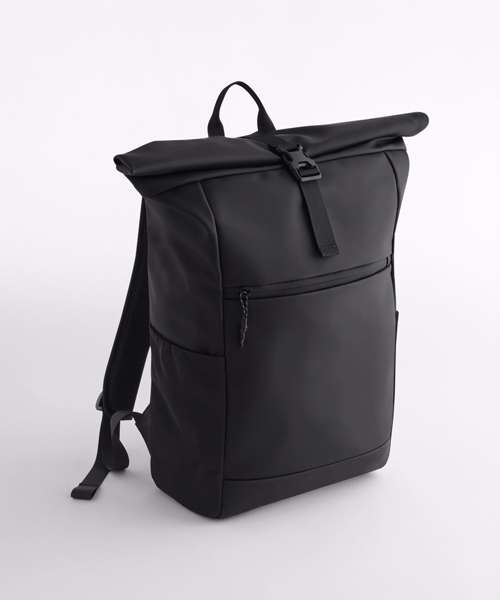 PVC-free. Minimalist styling. Water-resistant materials. Zipped main compartment. Elasticated mesh side pockets. Internal padded laptop sleeve, compatible up to 16". Padded back panel. Front pocket with water-resistant zip closure. Secure roll-top and clip closure system. Cord zip pulls with reflective detailing. Padded, adjustable shoulder straps. Grab handle. Tear-away label for ease of rebranding. Lining: 100% Recycled polyester.