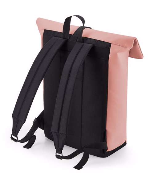 100% Recycled polyester with matte-look PU coating. PVC-free. Water-repellent fabric. Padded internal laptop sleeve, compatible up to 15.6". Minimalist styling. Zipped front pocket. Double-layer base panel for durability. Roll-top closure. Secure clip closure. Padded adjustable shoulder straps. Grab handle. TearAway label for easy rebranding.