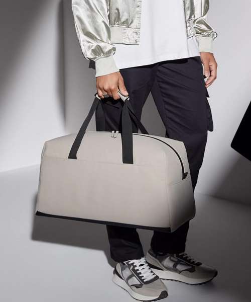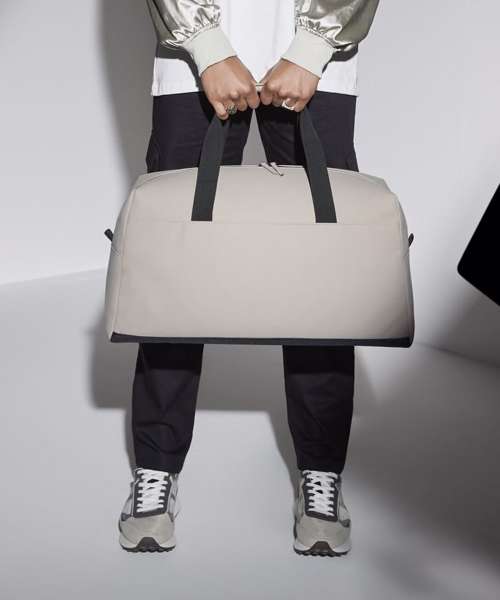 100% Recycled polyester with matte-look PU coating. PVC-free. Water-repellent fabric. Minimalist styling. Extra-long main compartment zip for easy access. Zipped internal valuables pocket. Double-layer base panel for durability. Self-fabric handle wrap. Webbing carry handles. Can be carried by hand or over the shoulder. TearAway label for easy rebranding.