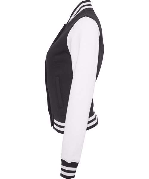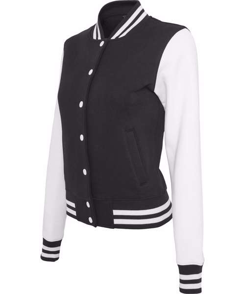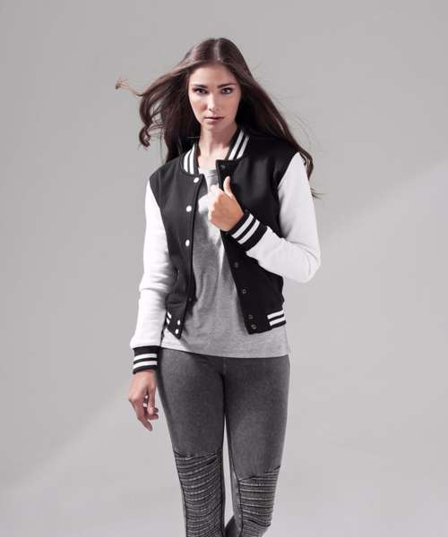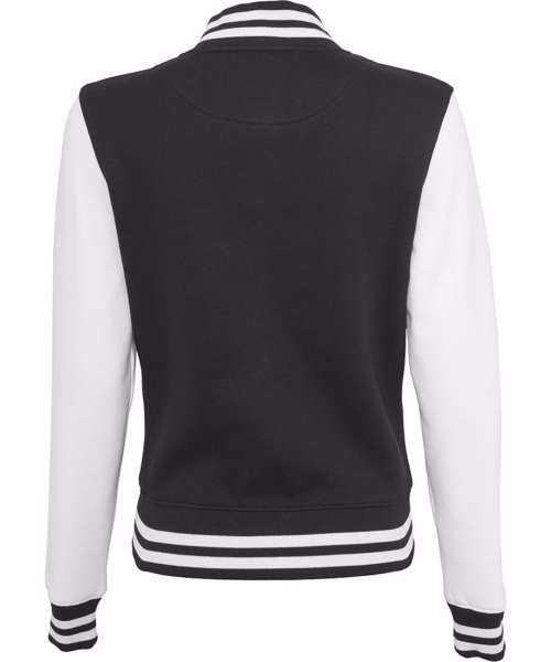 The college style presents itself as a cool stylish women's jacket with contrasted cuffs to offer a preppy look and feel. The inside brushed sweat fabric ensures a comfortable fit. Typical details include; striped rib cuffs at the collar, hem and sleeves and metal press-buttons to emphasize the cool look. Two pockets on the front, set-in sleeves and neck half-moon with neck tape.
