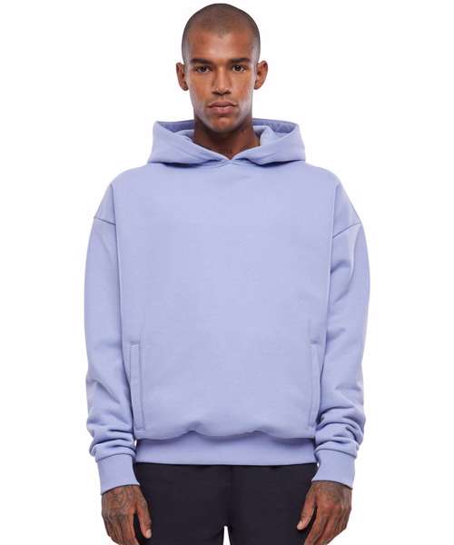 The men's hoodie features a large hood and wide rib cuffs on the sleeves and hem. The integrated kangaroo pockets add a practical touch. A casual urban fit with dropped shoulders creates a masculine silhouette. The men's hoody is made of smooth and heavy brushed fleece, which can be further refined using flex or screen printing.
