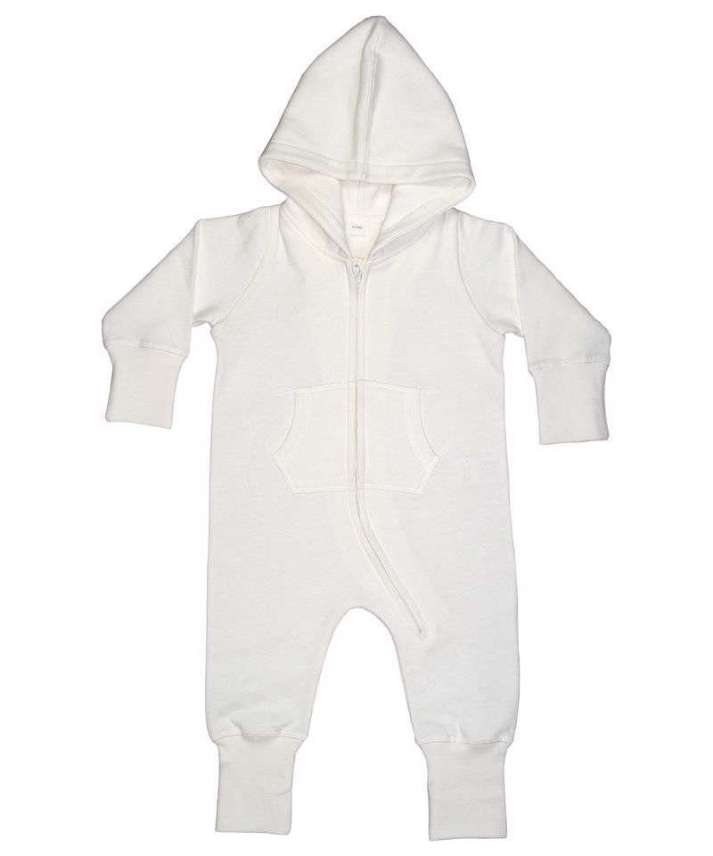 Baby and toddler All-in-one with cosy and soft brushed inner, and both 3 piece hood and extra-long cuffs (which can be folded back or left longer) for optimum fit. No centre back seam for increased decoration potential. Comfort tabs at top of zip. Oeko-tex® class 1 approved fabric. “Well-made” ethical manufacturing process. Brand-free back-neck area with tear off size and style label only. Oeko-Tex certified.