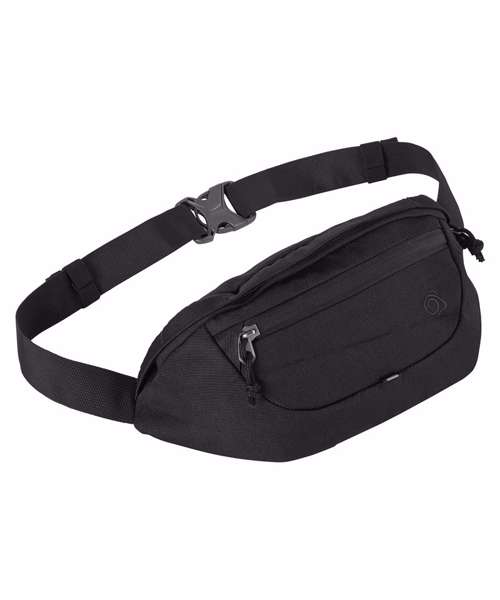 Waist pack featuring handy security pockets. Recycled polyester 900D with EcoShield DWR finish. PU backing and recycled zip tape to all zips. Reflective detail and gear loops.