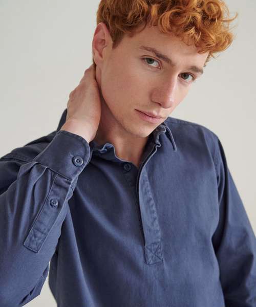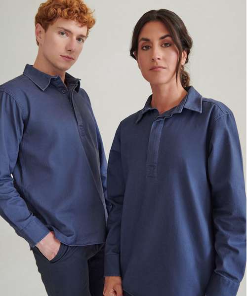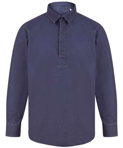 Long-sleeved plain drill shirt. Pullover with concealed button fastenings. Heavy garment wash. Adjustable button cuff and placket. Shaped hem. Back neck hanging loop. Back neck buggy. Self-fabric vent inserts. Tag-free for easy rebranding.