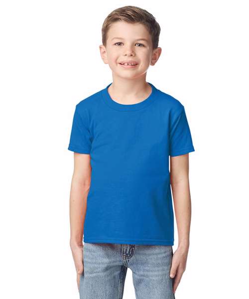 Made with our soft ringspun cotton and cotton blends, the Softstyle™ midweight youth t-shirt features high stitch density fabric that offers a smooth printing surface, ideal for DTG. Soft ringspun fabric feels great against your skin. Non-topstitched, classic width, rib collar. Taped neck and shoulders for comfort and durability. Modern classic fit, tubular body – side seam on size Small. High-performing black tear-away label. CPSIA Tracking Label Compliant.