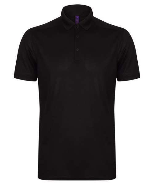 Modern fit wicking men's polo shirt with added stretch. Lightweight micro-fine piqué with a short point collar, fitted sleeve and cuffs. Front and back shoulder yolk detail. Micro-fine piqué is ideal for printing and embroidery. 3-button placket, dyed-to-match buttons. Henbury cut-out back neck brand label. Henbury cut-out back neck brand label. Wicking finish for added performance.