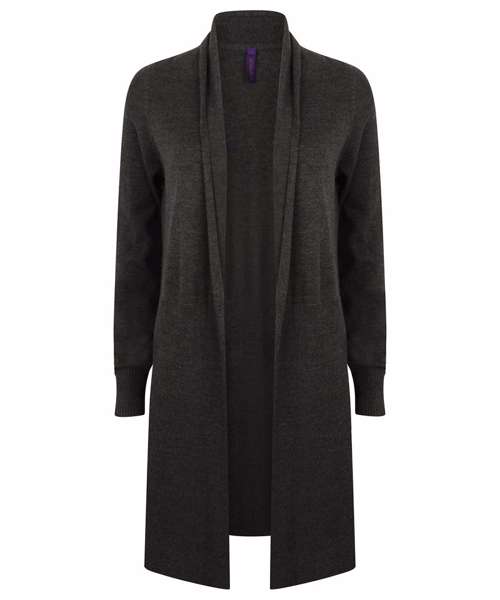 Fine knit, 12 gauge women's long line loose cardigan. Half ribbing detail on body and sleeves. Semi-fashioned sleeve. Henbury cut-out brand label. Co-ordinates with HB720 product range.