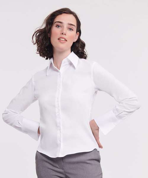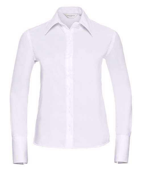 Made using the newest technologies of non-iron fabric that stays wrinkle free and keeps the wearer looking and feeling smart all day long. Contemporary fit combined with contemporary designed features. Stylish and relaxed long edged collar. Fashionable twin button fastening. Shaping at the waist for flattering feminine silhouette. Long, squared edge flared cuff with single button fastening and option for cuff links. Rounded hem.