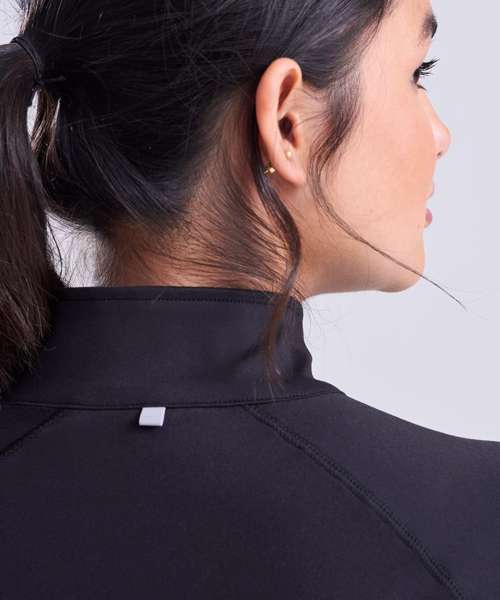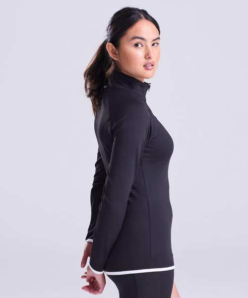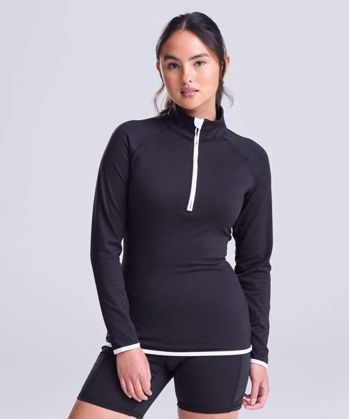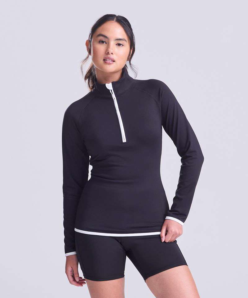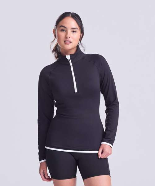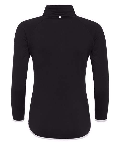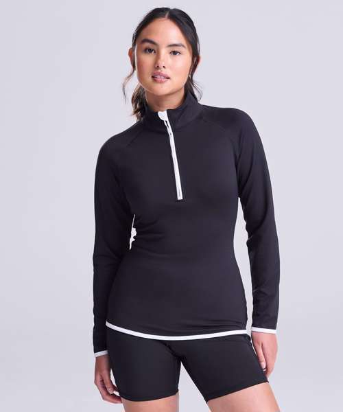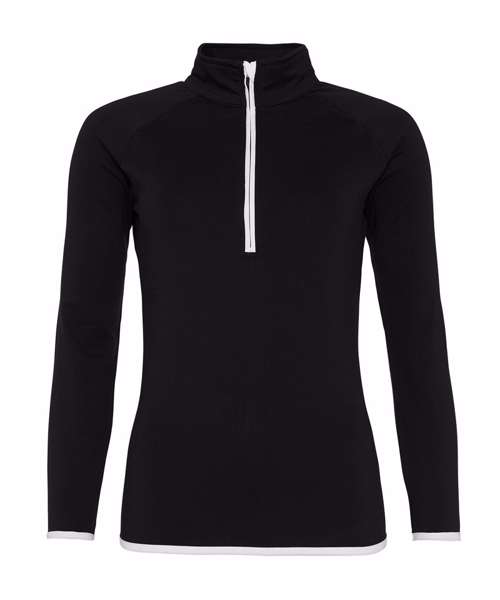 AWDis' own CoolFit blended fabric containing elastane that provides stretch for comfort and a great fit, girlie fit, reflective tab at back of neck helps keep ear phone cords in place, self-fabric contrast colour binding at zip, cuffs and hem, raglan sleeve design creates ease of movement, 1/2 zip with stand-up collar for warmth, chin guard prevents irritation, simple tear off label makes it perfect for rebranding, UPF 30+ UV protection.