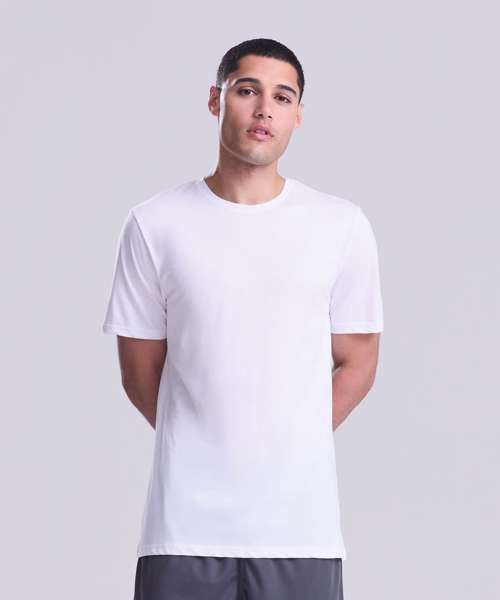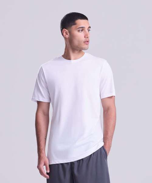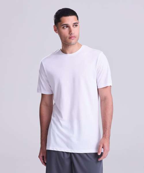 Active fit. Set-in sleeve design. Cotton polyester blended performance fabric. Self-fabric taped back neck. Twin-needle stitching detail. Self-fabric crew neck. Simple tear-out label makes it perfect for rebranding. UPF 40+ TBC. Inherent stretch fabric properties.