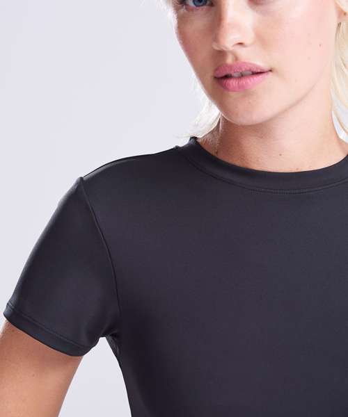 Move with confidence in this Women’s recycled cropped T, featuring four-way-stretch, quick-dry, moisture-wicking fabric. It’s designed for comfort with a fitted silhouette, durable twin-needle stitching and a tear-away label for easy rebranding.