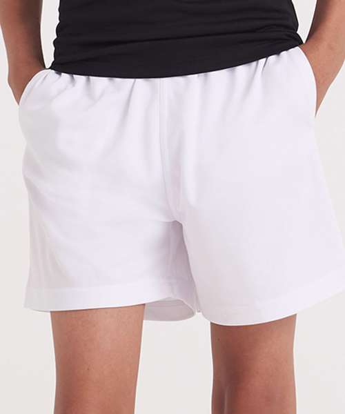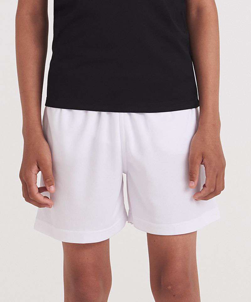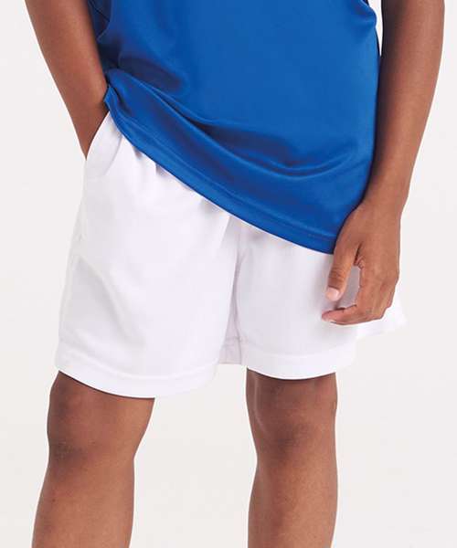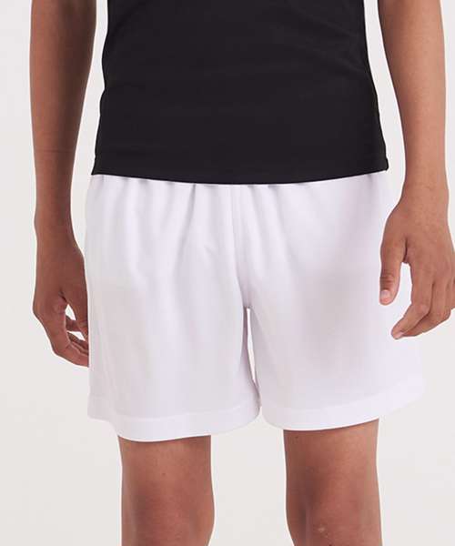 These kids’ shorts feature an elasticated waistband; a mesh lined inner, side pockets for storage, sweat wicking Neoteric™ fabric and plenty of room to move during sporting activities.