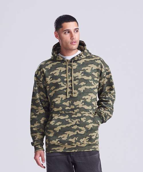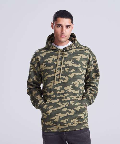Twin-needle stitching detail. Classic all over camo print. Flat lace drawcords. Double fabric hood. Kangaroo pouch pocket. Ribbed cuffs and hem. Soft cotton faced fabric creates ideal printing surface. Simple tear-out label makes it perfect for rebranding. Flat lace drawcords. Brushed inner fleece.