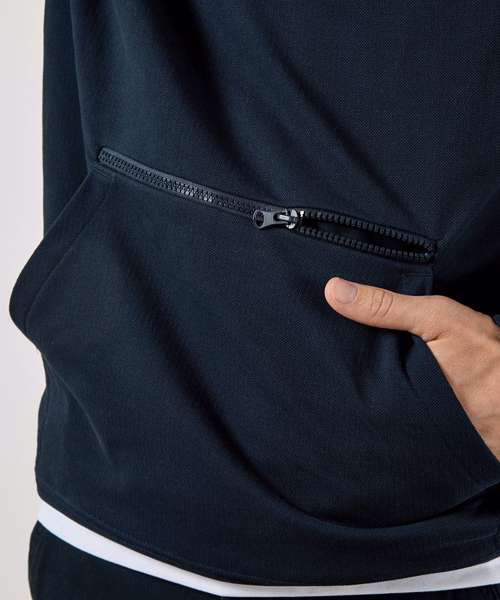 Regular fit. Piqué-faced fabric. Raised hood with self-coloured Jersey lining. Full-needle, double-layered cuff and welt. Self-coloured back neck and inner collar Jersey binding. Self-coloured flat tape cord with metal ends. Matching metal eyelets. Kangaroo pocket with additional zipped pocket at top. Self-coloured plastic zip and metal zip pull. Double-edge stitched cuff and welt. Double-stitched armholes. Tear-out back neck label.