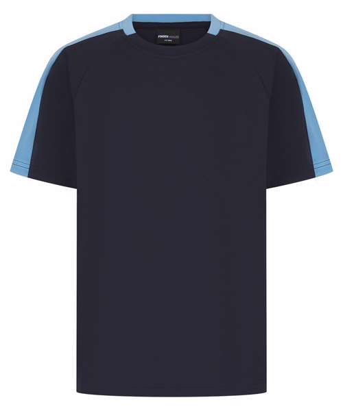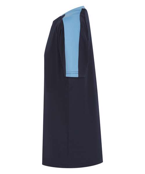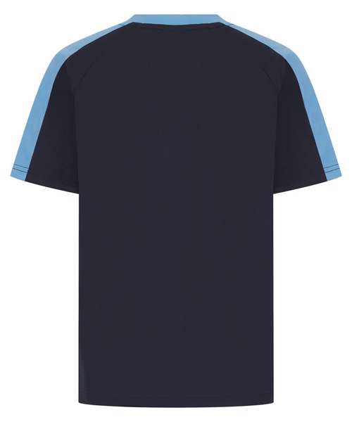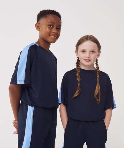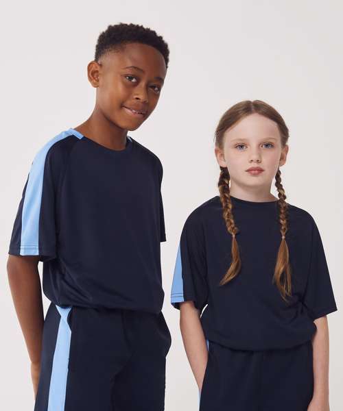 Kids team t-shirt with self-fabric contrast colour sleeve panels. Sports fit. Wicking finish provides moisture management. Quick-dry and breathable. Self-fabric, two-piece collar. Raglan shoulder. Tear-out label for easy rebranding.