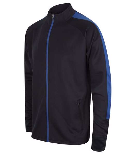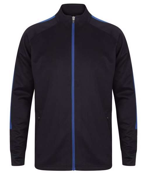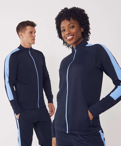 Knitted tracksuit top with contrast colour panels on outer sleeve. Contrast colour centre front zip. Zipped side pockets. Funnel neck and 1x1 ribbed cuffs. Semi-automatic lock zip sliders on all zips.