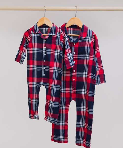 Babies’ all-in-one tartan pyjamas with self-fabric chest pocket. Button-down centre front and internal YKK poppers around the inseam and self-fabric gusset. Self-fabric cuffs on sleeves and legs, and self-fabric pyjama collar.
