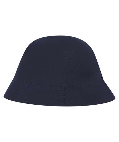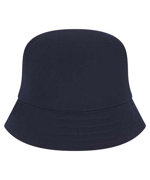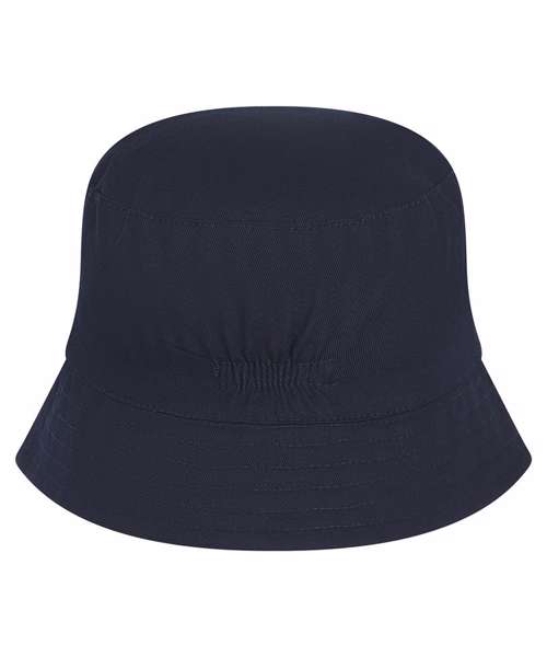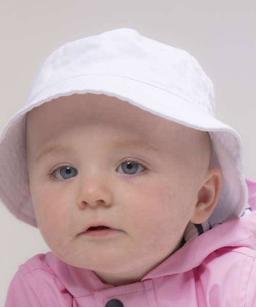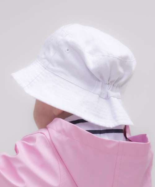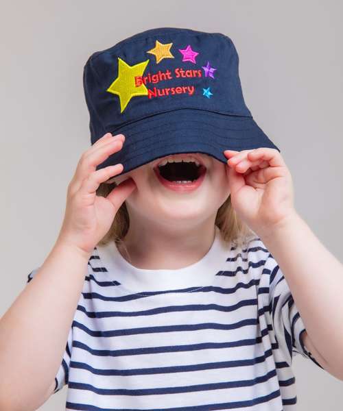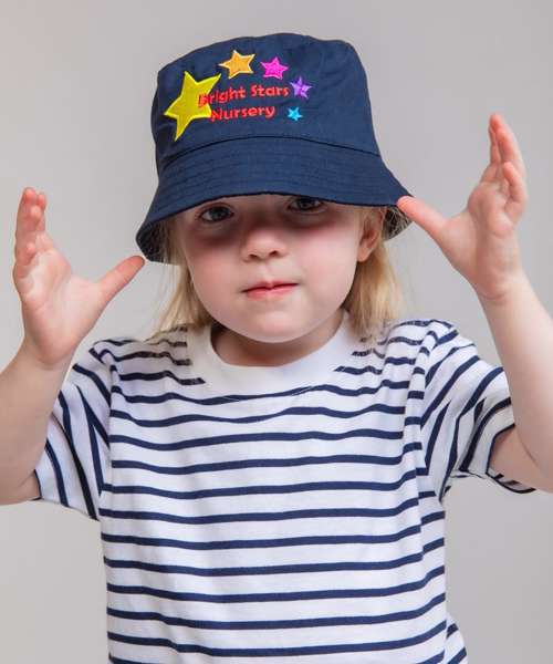 Kids bucket hat. Three colourways. Top-stitched brim detail. Flat top. Elasticated back. Suitable for decoration.
