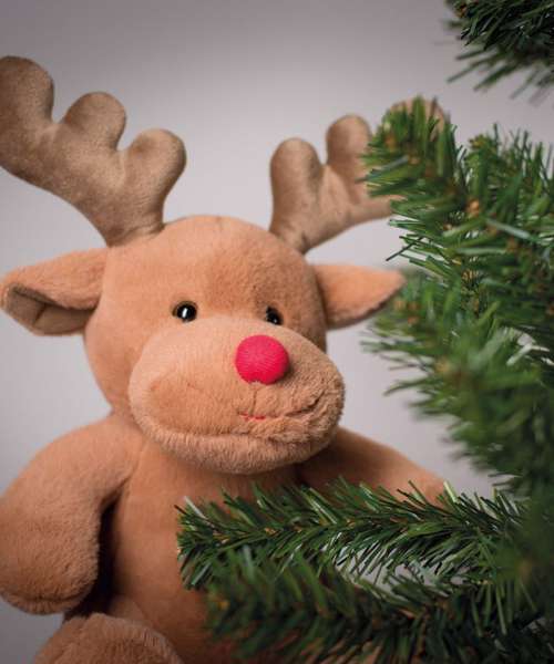 Santa's helper, the Reindeer has soft, brown coloured fabric with a bright red nose and contrast antlers.