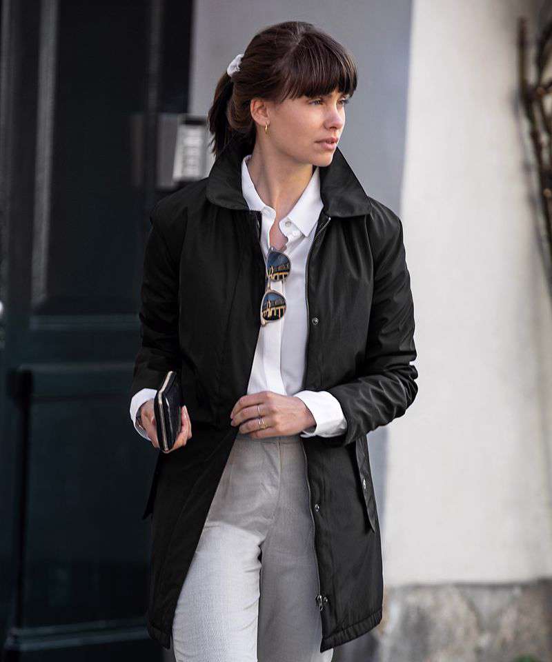 YKK main zip. Inner fabric vertical quilted to soft padding for insulation. Feminine ¾ length. Windproof. Water-repellent finish (Bionic Finish® ECO).