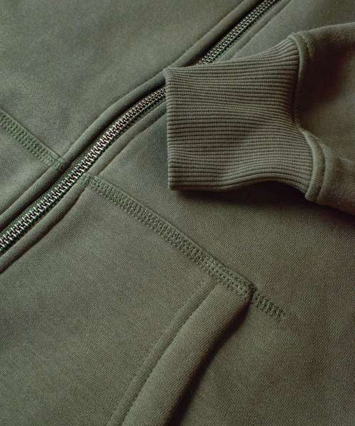 Double-layer fabric at hood. YKK metal main zip. Brushed fleece lining with short shave treatment. Combed long stabled fibre organic cotton. Organic Content Standard 100 (OCS Certified, CU1038206).