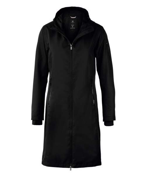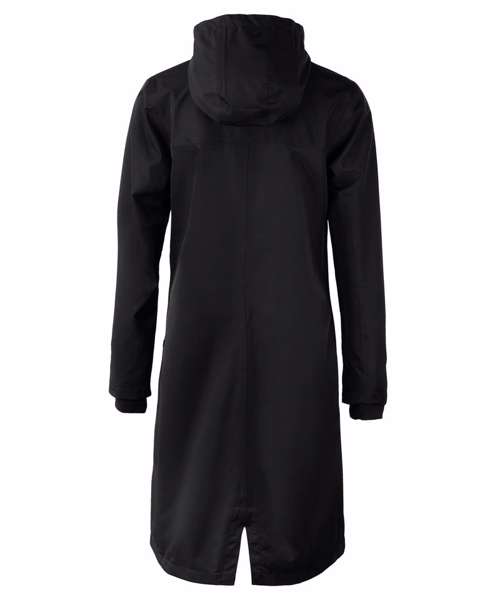 Windproof and waterproof with taped seams. Hood with drawstring. Feminine ¾ length. Water-repellent finish (Bionic Finish® ECO). Windproof. Water resistance: 3000mm. Breathability: 3000gsm/24h. Critically taped seams.