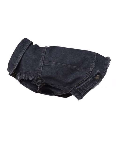 Snap/popper-attaching stretchy denim jacket with raw edge sleeves. Reinforced slit so it can be worn over the harness. Back length – XS: 25cm; S: 30cm; M: 35cm; L 40cm; XL: 45cm; 2XL: 50cm.