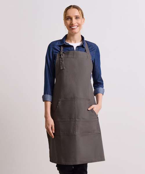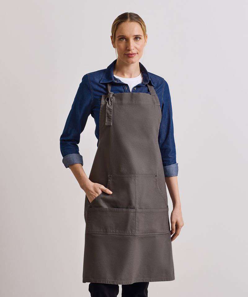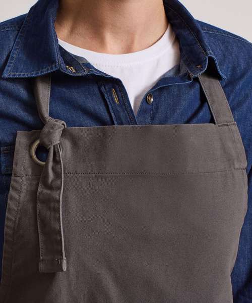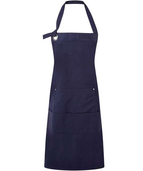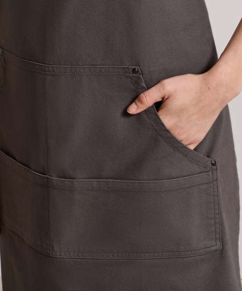 Full bib apron with kangaroo style pockets. Rivet detail and gun metal eyelet. Knotted neckband for height adjustment. Heavy canvas cotton. Self-fabric ties.