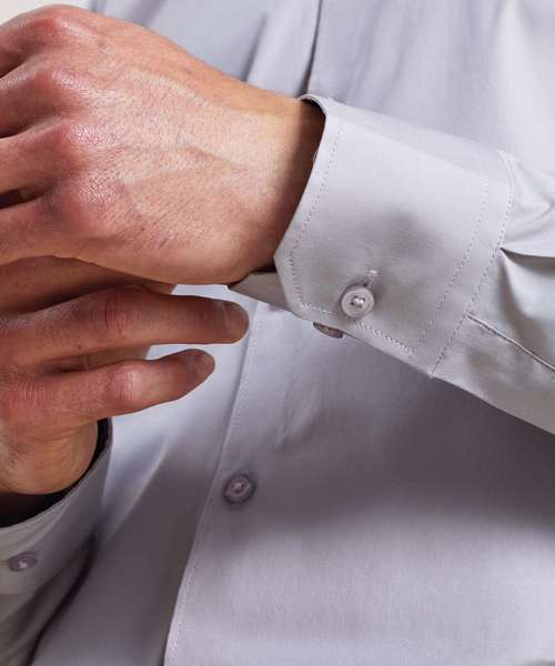 Cotton combined with elastane makes for a super soft, stretchy and comfortable fitted style for men. Double buttons on the cuff, together with a single button sleeve guard, allows for either a formal arm or a more casual roll back option. Styled with a stiffened cut-away collar with top button - which again, can be worn formally with a tie or open collared for a more relaxed look.