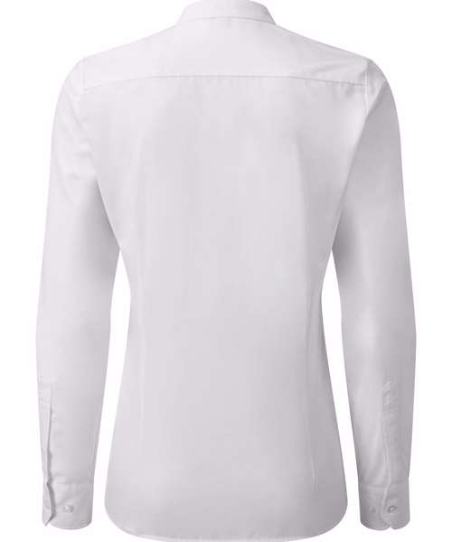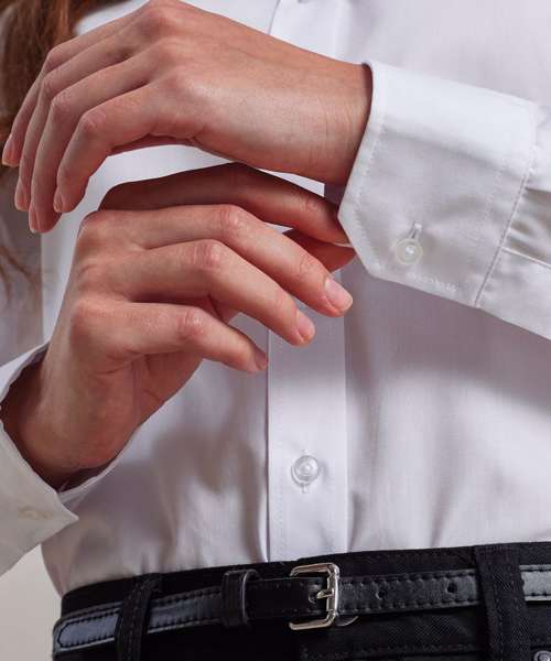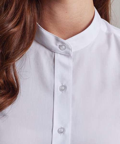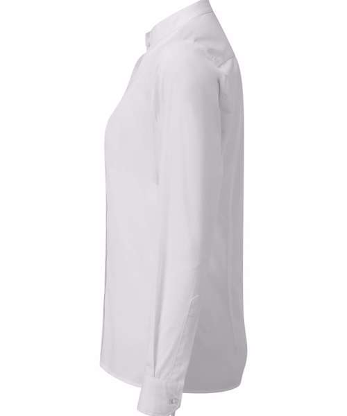 This iconic shirt is a welcome addition to our hospitalitywear collection and is a popular style for wearing front-of-house. The distinctive collar features a narrow banded fabric strip that runs around the neck and fastens at the front with a top button. Double buttons to the cuff and a sleeve guard allow for a more casual rollback option on the arm. Styled with bust and back darts and a curved hem for a flattering feminine fit.
