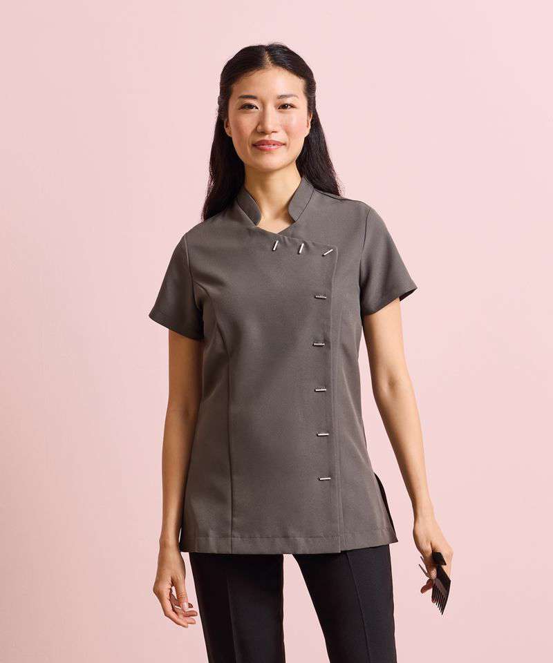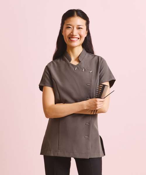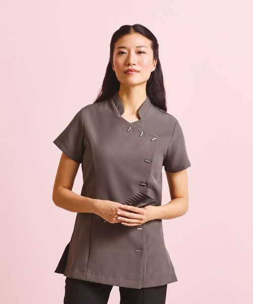 This popular 'Orchid' tunic is available in a wide range of colours and features an asymmetric design with eight 'bar' buttons down the front. The side vents and princess seams create a flattering fit whilst the short sleeves and back pleat allow complete ease of movement. A great uniform solution for salon staff who need to look co-ordinated.