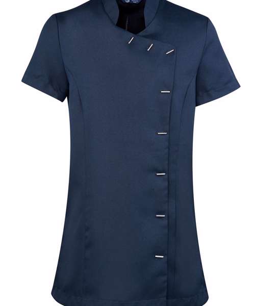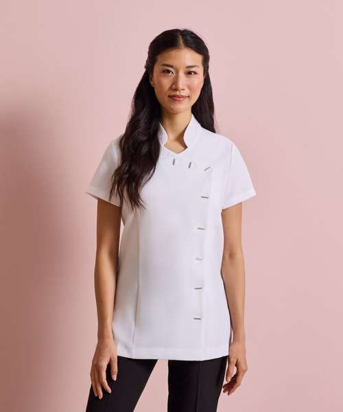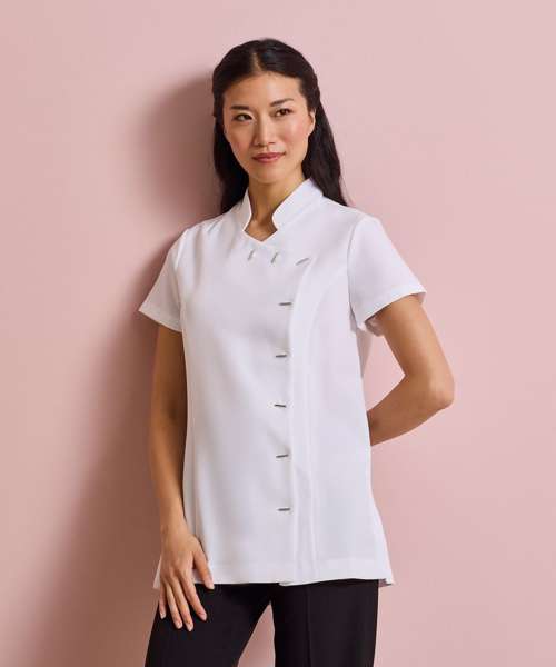 Beauty and spa tunic with mandarin collar. Asymmetric button fastening to the front with eight bar shaped buttons. Short sleeve. Side vents. Back pleat for ease of movement. Princess seams. Easycare.