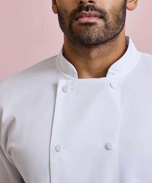 A long sleeve chef's jacket constructed with Coolchecker® fabric. The centre back panel is made from the Coolchecker® fabric which offers exceptional moisture management and wicking properties so chef stays fresh and cool during service. A wrap over fastening with ten self-fabric buttons, a mandarin collar and a useful double pen pocket on the left arm.