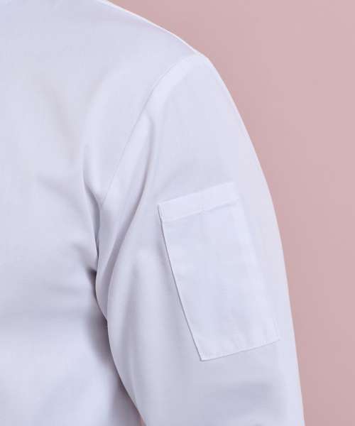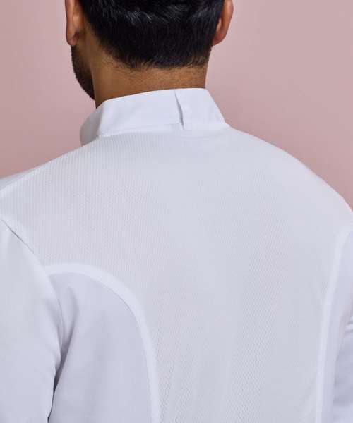 Coolchecker® mesh back panel. Wrap over fastening with ten self-fabric buttons. Mandarin collar. Left sleeve double pen pocket.