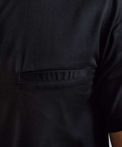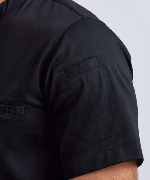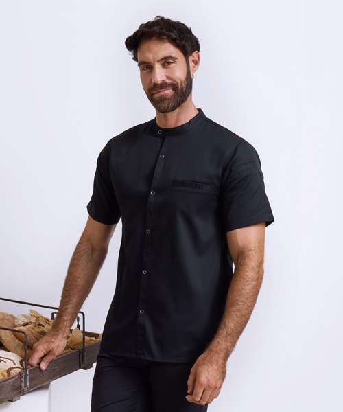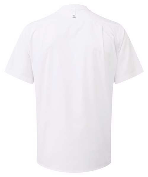Lightweight short sleeve chef’s shirt made with certified recycled polyester. Mandarin banded collar and press stud closure. Contrast inner neckband. Two pen pockets on left arm. Welt pocket to front left chest with combined pen pocket and faux top stitching. Pocket bag can be moved to allow for embroidery. Back yoke with pleats for ease of movement through chest and shoulders. Press stud tab to the back for hanging or securing an apron in place. Reinforced side seams.