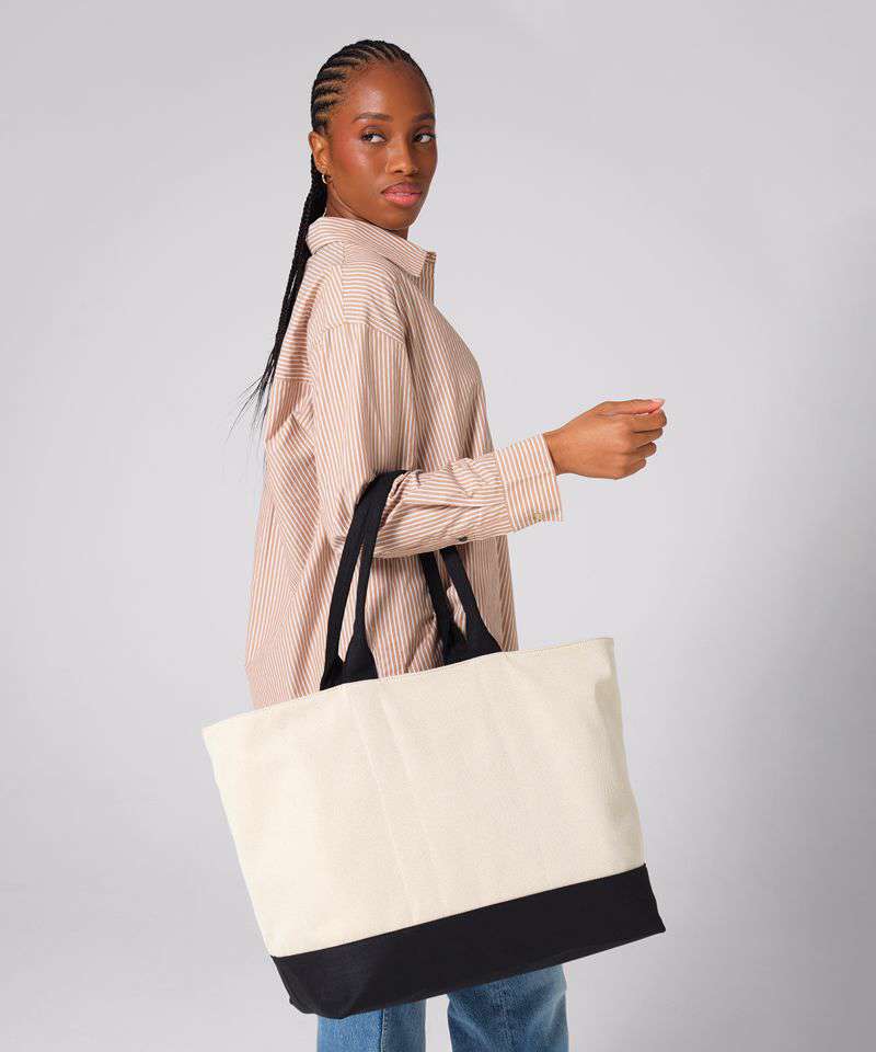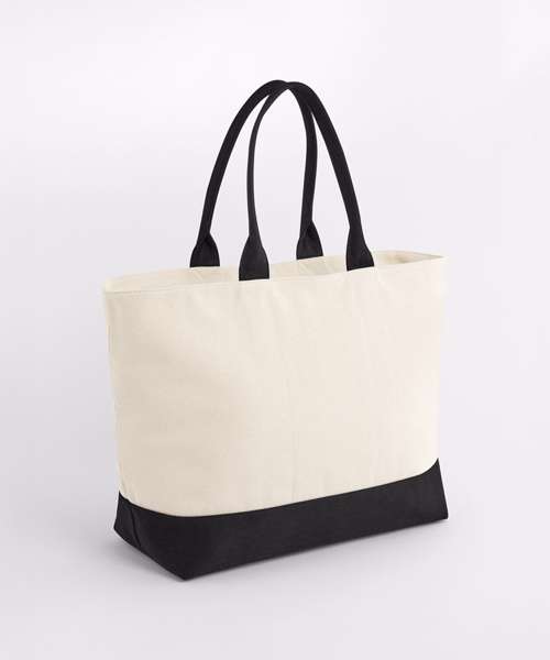 Structured design. Premium twill fabric. Soft-touch lining. Hidden-lining zip for easy decoration access. Zipped main compartment. Zipped internal valuables pocket. High-shine gold metal trims. Self-fabric carry handles. Can be carried by hand or over the shoulder. TearAway label for ease of rebranding. Lining: 100% recycled polyester.