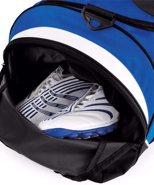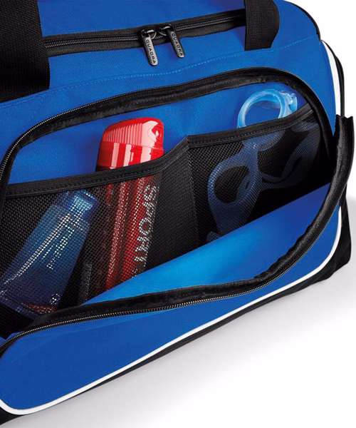 Detachable adjustable shoulder strap with pad. Shoe tunnel/wet pocket. Internal valuables pocket. Elasticated bottle loops. Zippered end pockets. Internal mesh pockets. Padded hand grip.